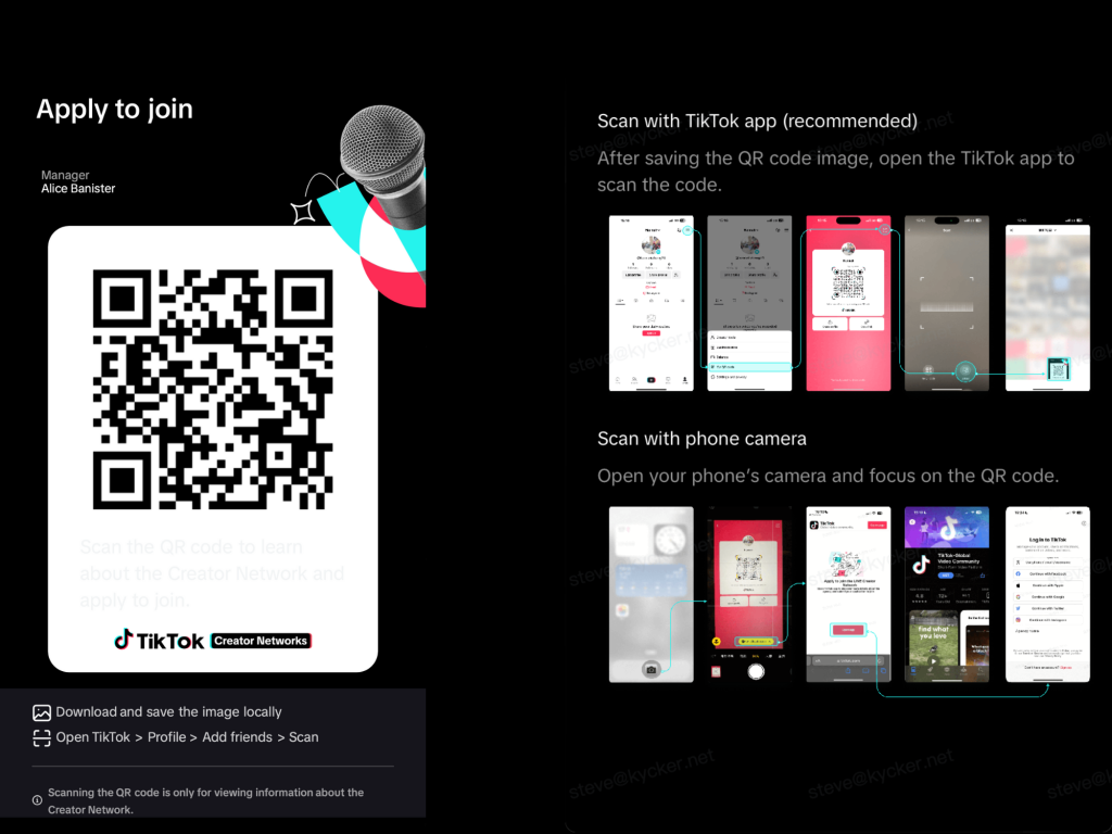 Scan the QR code on this page in TikTok. This takes you to TikTok’s Creator Network Scout page for our agency. Log in with your TikTok account and submit your details.